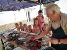 A Heves Megyei Népművészeti Egyesület tagjai, az alkotó tábor mesterei szakítottak időt arra, hogy szakmájukkal is meg ismertessék a csemetéket. Kupihár János fazekas vezette a kezüket, csillogó szemmel nézték, hogyan szaladt az agyag a korongon, gyúrták, markolták, alakították, készítették a saját csodájukat. Gulyás Béla gyertyamártó segédletével pici formákba loccsantották a forró viaszt, hogy kihűlve örömmel adhassák szüleiknek a különböző színű saját készítésű gyertyákat. A foglakozás végén kórusban kiáltották: köszönjük gyertyás Béla bácsi! Tóth Lóránt fafaragó, játékkészítő rögtönzött műhelyében kicsi fa játékokat készítettek. Zümmögött a fűrész, koppant a pici kalapács, már is kész egy kis autó, szinte elrepül a madárka, lepke. A gyermekek önfeledten, saját készítésű játékaikat tolják, reptetik. Talán néhányan később ennek az élménynek hatására fogják kezükbe a faragókést, ülnek a korong, az agyag mellé és olvasszák a gyertya viaszát, hogy ők adják tovább a kézműves csodát.
