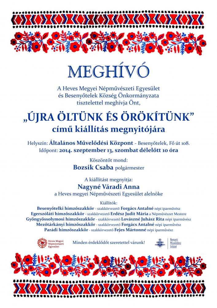 A program ugyan lezárult, de van folytatás, hiszen a községekben népművészeink irányításával továbbra is működnek a szakkörök. Ezt bizonyítja az is, hogy szeptember 13-án, Besenyőtelken a Heves Megyei Népművészeti Egyesület a település önkormányzatával közösen „Újra öltünk és örökítünk” címmel kiállítást rendezett az öt szakkör alkotásaiból. Bozsik Csaba Besenyőtelek polgármestere köszöntőjében hangsúlyozta e rangos kiállítás értékeit. A kiállítást Nagyné Váradi Anna a Heves Megyei Népművészeti Egyesület alelnöke nyitotta meg, aki bemutatta a Nemzeti Művelődési Intézet kezdeményezésével és támogatásával megvalósult sikeres programot.