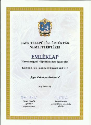 A Heves megyei Népművészeti Egyesület egri népművészeinek, kézműveseink, népművészeti értékei „Eger élő népművészete” címmel bekerült az egri Települési Értéktárba 2014. jun. 4-én.