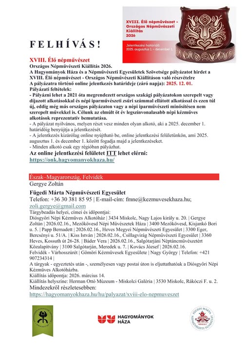 A pályázati kiírás részletei: https://hagyomanyokhaza.hu/hu/palyazat/xviii-elo-nepmuveszet oldalon érhetők el.