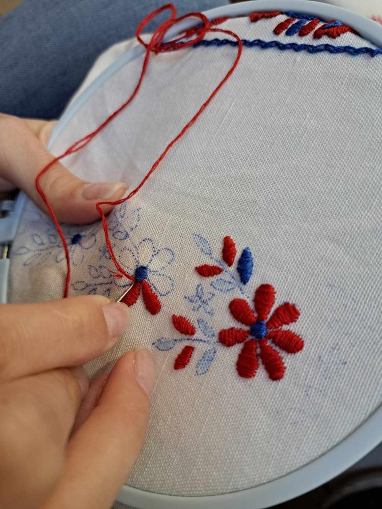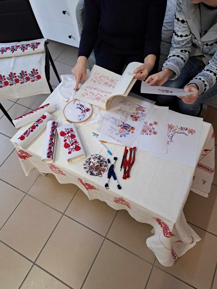 5. foglalkozás tervében szerepelt egy palóc asztali futó készítése is, amihez most egy rendhagyó, korszerűbb színvilágot alakítottak ki. Andrea választotta ki a színárnyalatokat a futó kihímzéséhez. Lilás, kékes árnyalatok állnak hozzá közel, így kicsit „újra gondolva” a palóc hímzést, most ezekkel a színekkel kezdett bele a munkába.