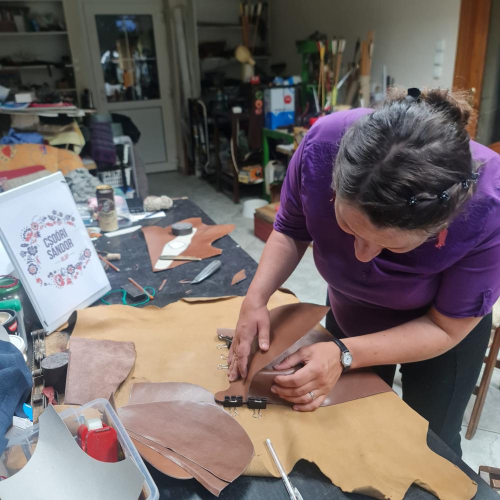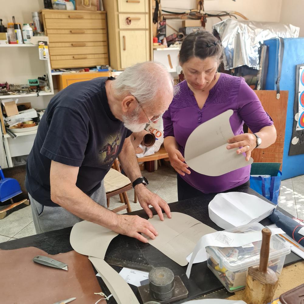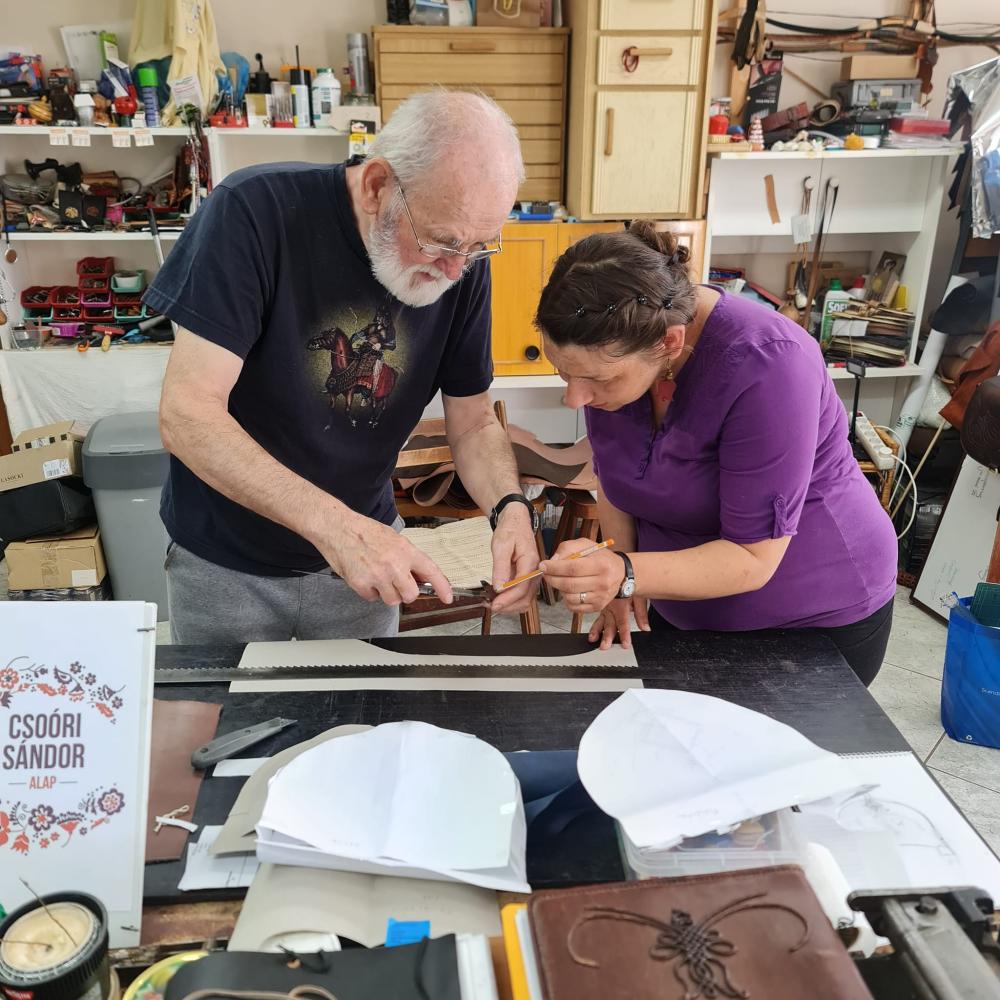 Első foglalkozásuk az online térben zajlott, ahol megbeszéltek mindent, ami a kezdéshez szükséges. Így Ágota 2024. április 13.-án már a papírból elkészített szabásmintával érkezett a Mesterekhez, a műhelybe. Egy kicsit változtatni, alakítani kellett a mintán, mivel a bőr másképpen viselkedik a valóságban, mint a papír. A megfelelő bőr alapanyag kiválasztása után hozzá is kezdtek az alkatrészek kivágásához, és megbeszélték, hogyan, milyen sorrendben kell azokat majd összedolgozni. Házi feladatként kell elkészítenie az összeállításhoz szükséges alkatrészeket, kédereket, a kanálcsíkot, a francia szegéshez a bőrt. Valamint a táska fedelén és az övön felhelyezésre kerülő zománc díszt.