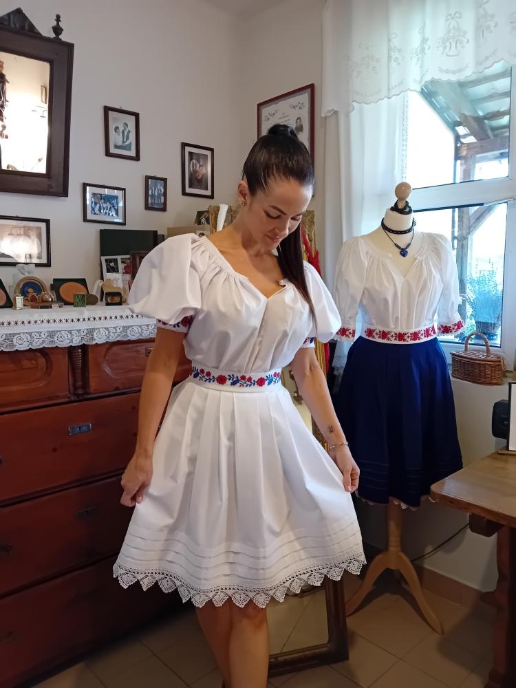 A munkát folytatva az alsó szoknya elkészítéséhez fogtak. A fehér szoknya visszaszegését fehér farkasfoggal díszítették. A fehér szoknya derékrészét körbe berakták a megfelelő derékbőségre és rátűzték a derékpántot. Kiszabtak még egy ingvállat, amit meg is varrtak.
