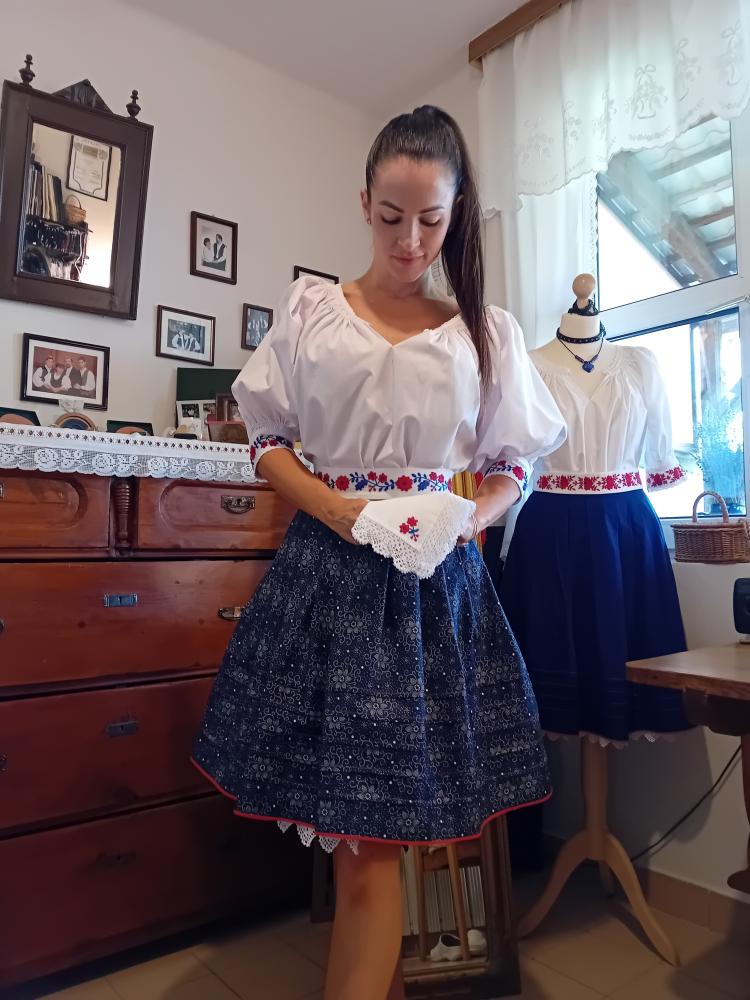 Elkészültünk a hollókői viselettel! Elkészült a hímzett ingváll, a fehér alsó szoknya a kékfestő szoknya, hozzá hímzett öv és 1 db. hímzett keszkenő. Ráadásként készítettek még egy ingvállat is hímzés nélkül.