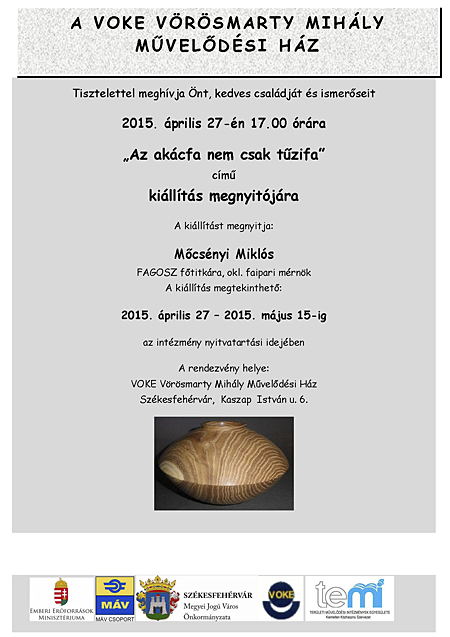 Az akác nem csak tűzifa címmel nyílt kiállítás Székesfehérváron a VOKE Művelődési Házban április 27. -én. Akácból készül faragott és esztergált tárgyak láthatóak, május 15-ig.