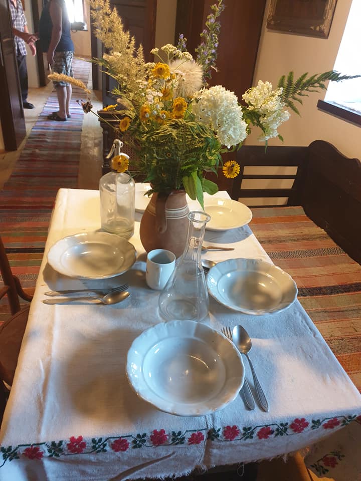 A lakószoba berendezése: vetett ágy, szentképek a falon, de van itt faragott lóca, terített asztal tányérokkal szódásüveggel, illetve tükör , ruhásszekrény, valamint egy varrógép is látható. Szövött rongyszőnyeg borítja a padlót. Az asztal fölött a szokásokat idézve a gerendára akasztott petróleumlámpa világítja meg a teret.
