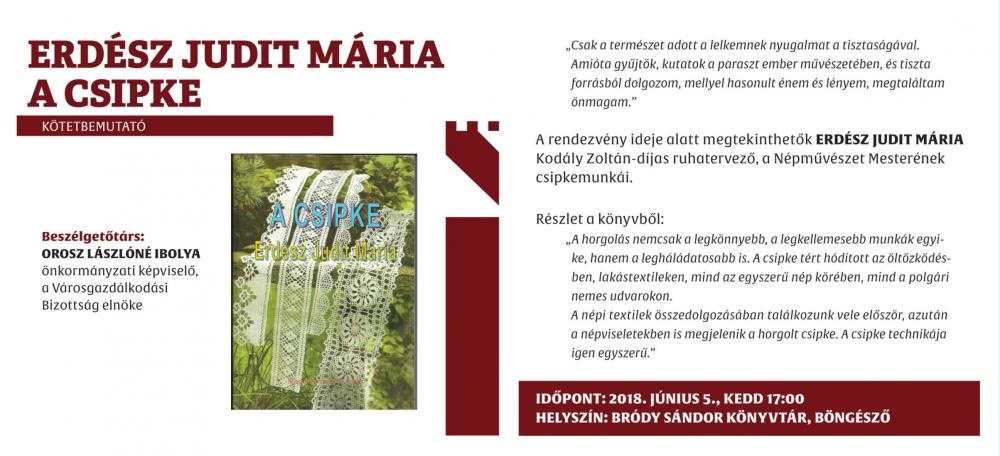 Az ünnepi könyvhét alkalmából jelent  meg  Erdész Judit Mária népi iparművész,  a Népművészet  Mestere, Kodály Zoltán-díjas  ruhatervező, a Heves Megyei Népművészeti Egyesület alkotójának az ötödik könyve,  " A Csipke"  címmel.