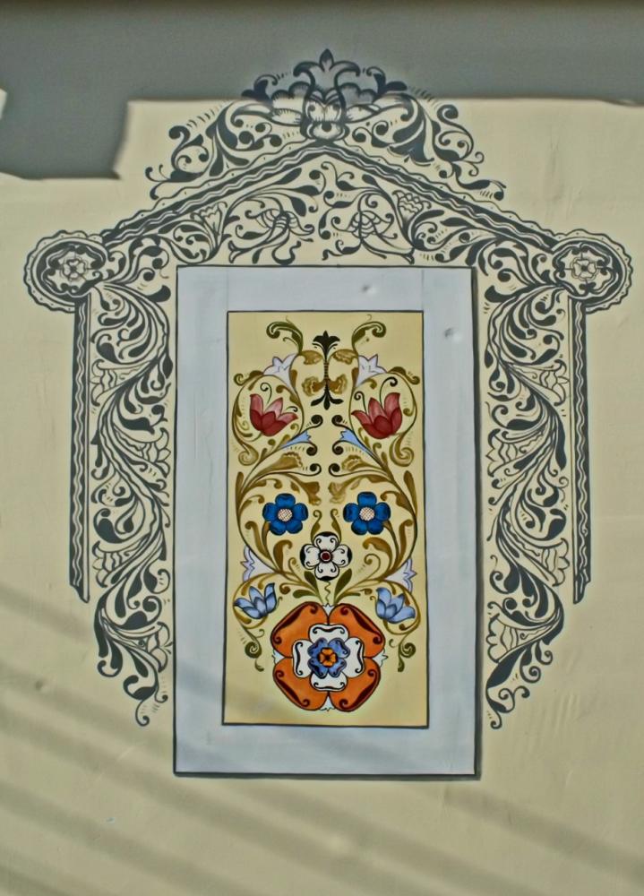 A népi iparművész a saját háza homlokzatát festette meg a közelmúltban feltárt sóji / Veszprém /