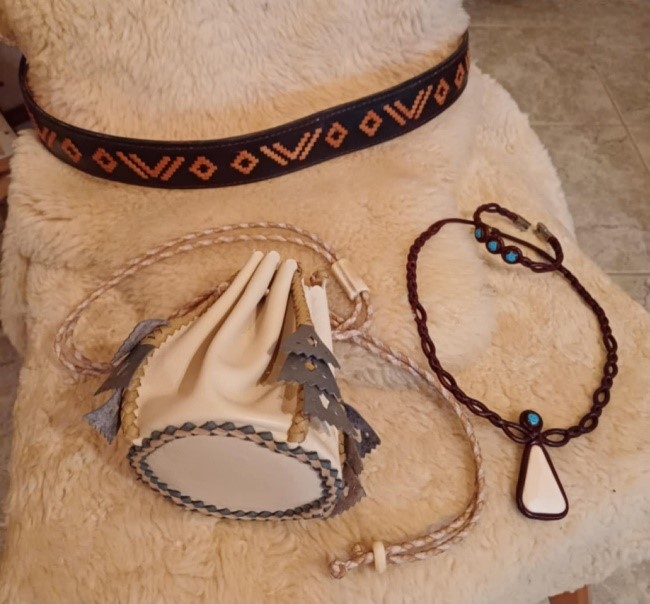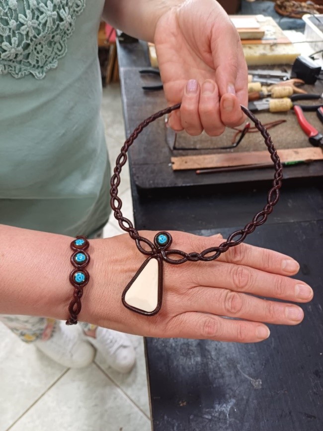Az előző foglalkozáson előkészített hengeres bőrből, csont medál felhasználásával a karkötőhöz illő nyakék készült. Ez után a pásztorművészet szironyozásos technikájával egy