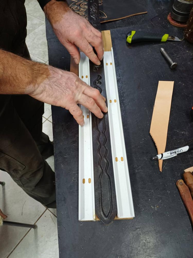 A kész öv bemutatása után tovább folytatódott a táska alkatrészeinek előkészítése az összeállításhoz. (szabás, festés, ragasztás)