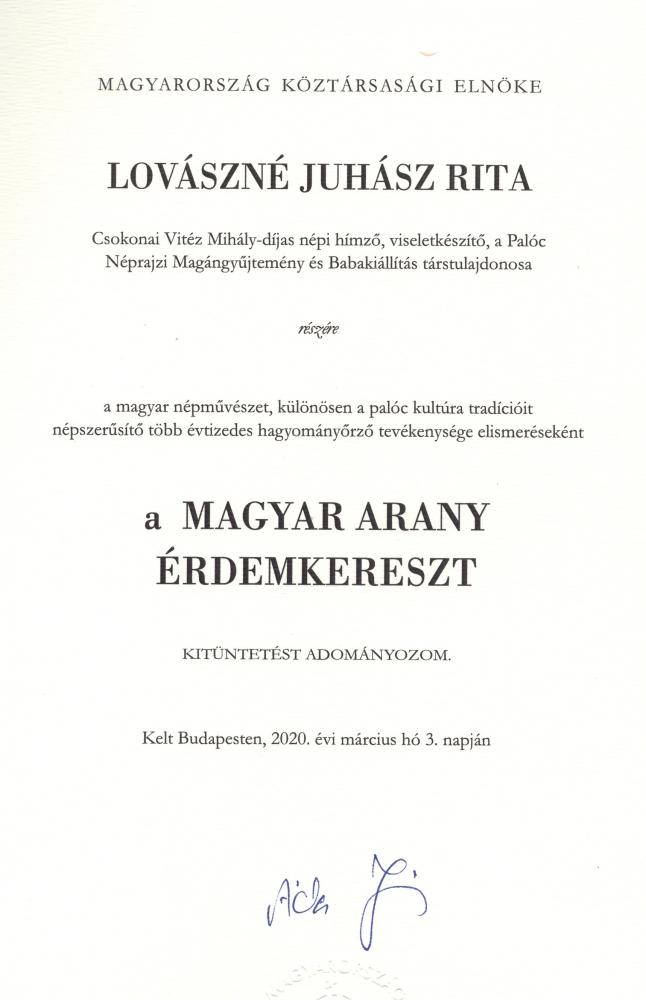 Lovászné Juhász Rita „ Csokonai Vitéz Mihály díjas” hímző - viseletkészítő Népi Iparművész a mátrafüredi Palóc Népművészeti Kiállítás tulajdonosa és férje Lovász Zsolt a Palóc Néprajzi Magángyűjteményért Alapítvány elnöke a magyar népművészet, különösen a palóc kultúra tradícióit népszerűsítő több évtizedes hagyományőrző tevékenységükért 2020 március 15. alkalmából Magyar Arany Érdemkereszt Köztársasági Elnöki kitüntetésben részesült.