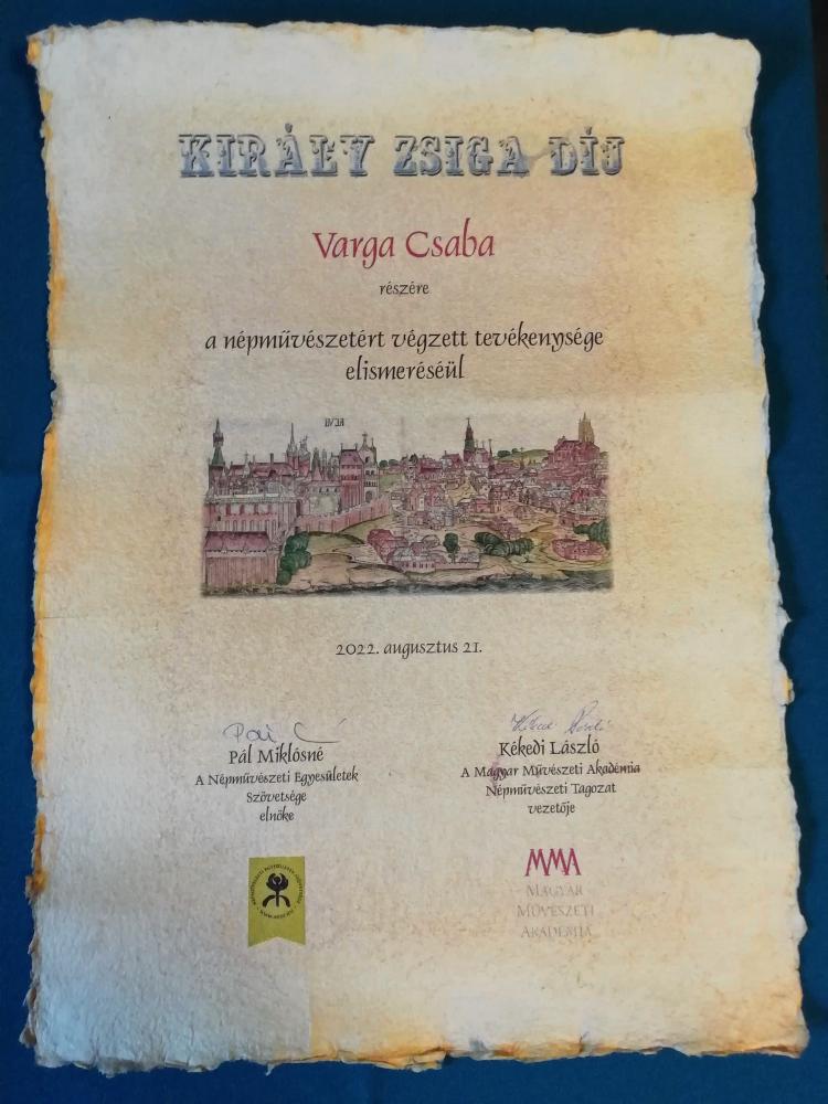 A hagyományokhoz híven a NESZ e fesztiválon adta át saját kitüntetéseit. Egyesületünk kiválósága Varga Csaba szaru-, csont- és fafaragó Király Zsiga díjat vehetett át. Ezúton is szívből gratulálunk neki.