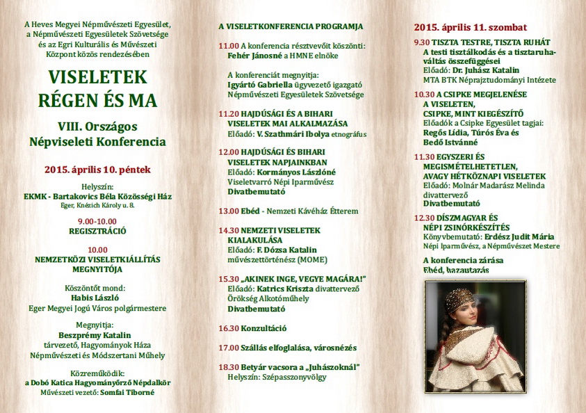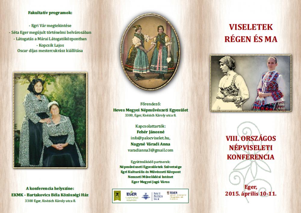 2015. április 10-én nemzetközi viselet kiállítás megnyitójával kezdődik a VIII. Országos Népviseleti Konferencia. Köszöntőt Habis László Eger Megyei Jogú Város polgármestere, megnyitót Beszprémi Katalin a Hagyományok Háza tárvezetője mond.