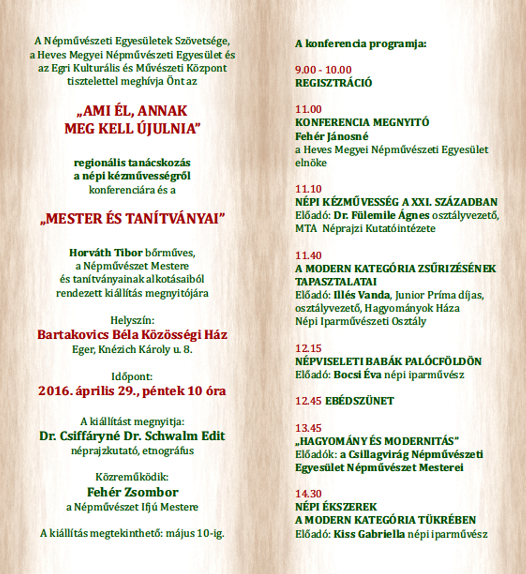 A Népművészeti Egyesületek Szövetsége és a Heves Megyei Népművészeti Egyesület Regionális Szakmai Konferenciát szervez a Hagyományok Háza támogatásával népi kézműves közösségek leendő és potenciális vezetői részére 2015. febuár 24-én 9..30 órai kezdettel.